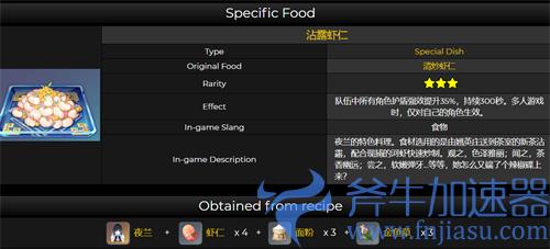 言归正传,夜兰特殊料理名叫:沾露虾仁,玩家们用虾仁、面粉、金鱼草就可以合成了,吃下后提升队伍中所有角色的护盾强效35%,持续5分钟!