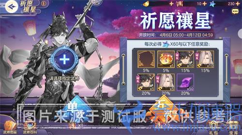 在祈愿禳星活动中,玩家可以选定关平和水镜进行招募,选择的武将会和其他材料一并进行抽取。