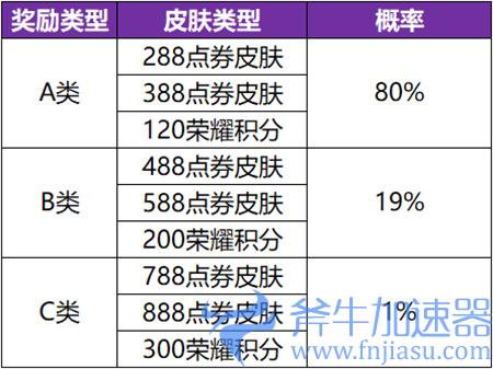 首先共赏芳华皮肤奖池中共有三类皮肤,其中最高的是788/888点券的史诗皮肤,不过只有1%的概率。