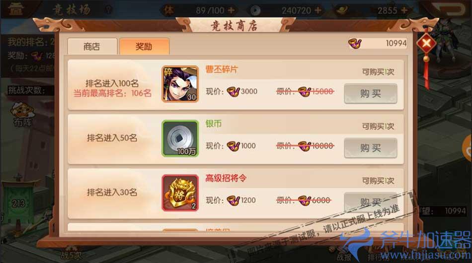 在11级竞技场开启后,少年们就可以通过挑战竞技场进行翻牌获得武将碎片了!有少年就会问到,一个一个碎片获得太难了,能不能有整个武将获得办法?别着急,小编这就告诉大家。在少年的竞技场打到前3500名时,在竞技场中点击“商店”-“奖励”,就可以看到,凭借少量的声望就可以换取30片徐盛碎片(可直接合成一个徐盛)。友情提示,少年只要一次进入这个名次就可以拿到奖励,所以前期少年要尽量提前打,早点拿到这个武将帮助在副本进行战斗。