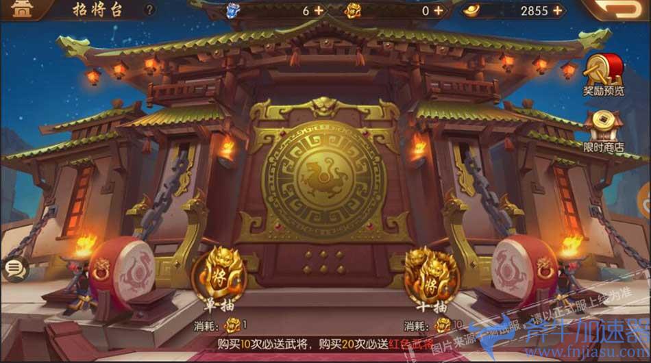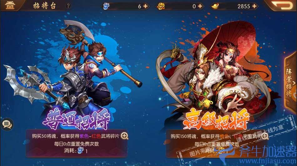 高级招将单次会获得50将魂,同时有一定概率获得养成资源,武将碎片和完整的橙色、红色武将,高级招将令在完成一些任务后获得,如果想要更多的话,就需要消耗一定的元宝才能获取,每300元宝一个,一次性买十个会打9折,即花费2700元宝。同时红将的抽取是有保底的,界面会提醒抽取多少次之后必会获得红将。