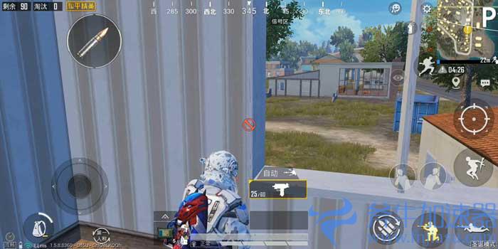 架点完成以后先去把舔包然后沿着马路往北边搜,搜到旋转楼开始拐弯往西北方向搜,搜到这个半开楼就可以停一下了,这里是一个非常好的架点,来到半开楼的楼顶,上到最顶上面向这个山字楼的这个角落,拉满疾跑就可以跳过去,这个山字楼的楼顶有很高的围墙保护,视野也要比半开楼更好,因为这个位置可以算是城头了,里面的玩家大概率是会出来的,可以在这里守株待兔。