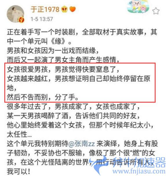 下图就是于正秒删的微博,微博内容在互联网上引起了很大的争议,取材真实爱情故事,疑似暗指陈晓赵丽颖。