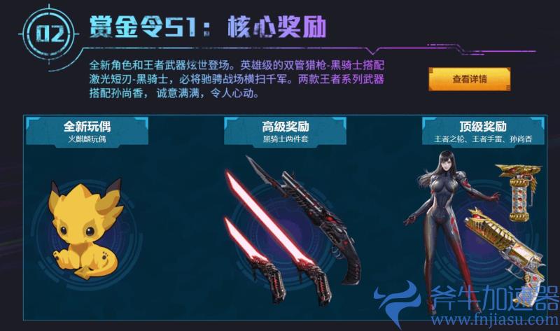 惊喜不止如此,玩家解锁“翼飞冲天”赏金令S1还将获得英雄级的“双管猎枪-黑骑士”,以及“激光断刃-黑骑士”,势必拥有驰骋战场、横扫千军的实力与勇气。此外,玩家还将获得全新玩偶“火麒麟玩偶”、王者之轮、王者手雷等众多福利。
