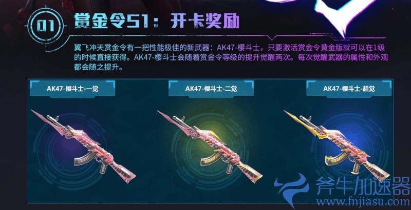 当玩家成功解锁“翼飞冲天”赏金令S1后,就能获得一把性能极佳的新武器“AK47-樱斗士”——玩家只需激活赏金令黄金版,就能在1级的适合直接获得该武器。AK47-樱斗士会随着赏金令等级的提升觉醒两次。每次觉醒,武器的属性和外观都会随之提升。