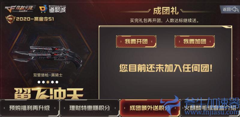 在CF手游2020年“翼飞冲天”赏金令S1预售活动中,当玩家成功购买“黄金基础版”或“黄金钜惠版”后,可选择开团或加入好友的团;当拼团人数达到指定人数后,团内的所有玩家可以获得对应的拼团奖励。