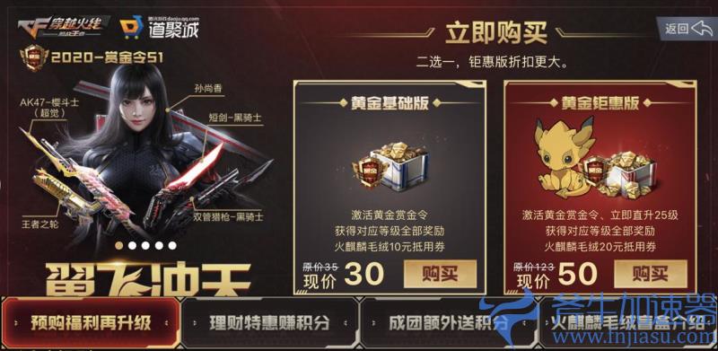 其中,“黄金基础版”限时85折开售,玩家可据此激活黄金赏金令领取对应等级全部奖励,以及火麒麟毛绒10元抵用券;“黄金钜惠版”限时4折开售,玩家可据此激活黄金赏金令且立即直升25级,并领取对应等级全部奖励,以及火麒麟毛绒20元抵用券。