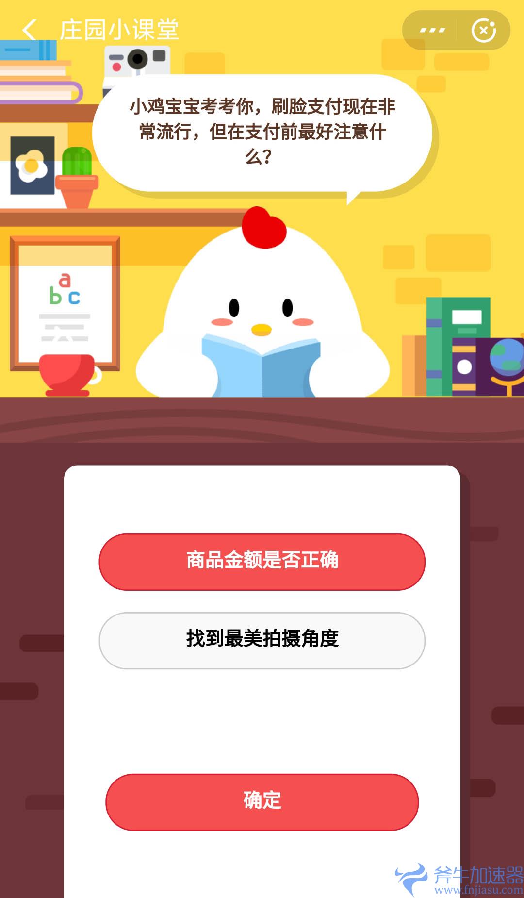 蚂蚁庄园12月20日庄园小课堂的题目是“刷脸支付现在非常流行,但在支付前最好注意什么?”很多网友都不知道正确答案是什么,接下来小编就来告诉正确答案,希望对大家有所帮助。