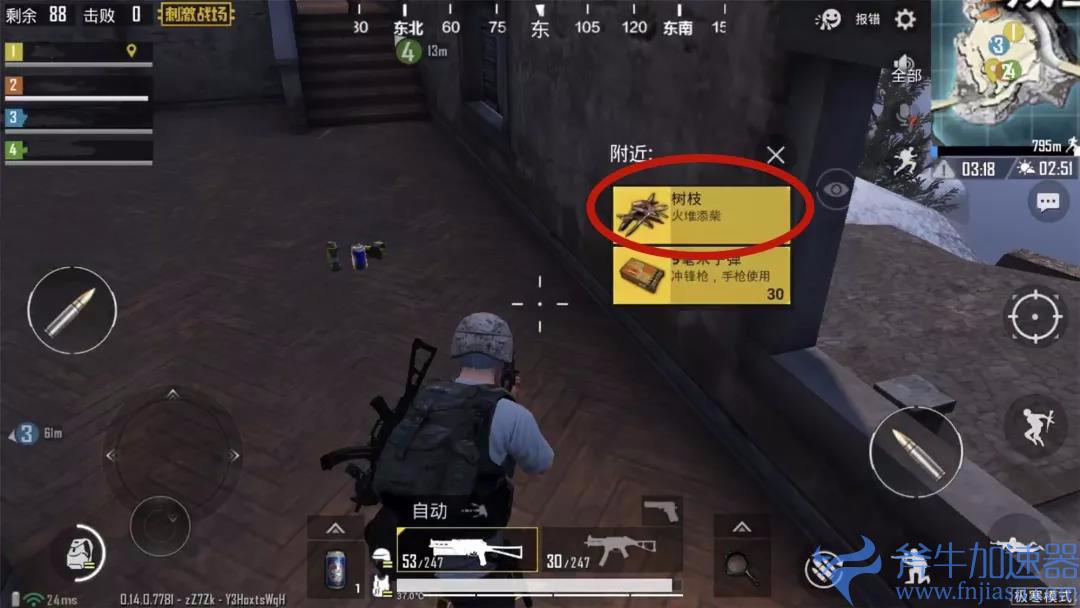 1、在地图中收集树枝或击败敌人搜刮盒子获得树枝,生火时至少要有一根树枝。