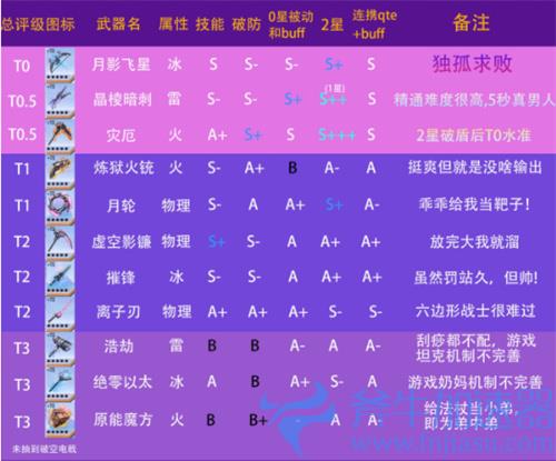 简单概括,在内测版本中月影飞星、晶棱暗刺、灾厄这三把都是非常强势给力的武器,能抽到绝对值得培养;而炼狱火铳、月轮同样非常不错。
