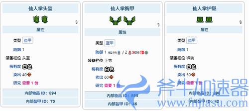 仙人掌套装由三件套组成,它们分别是仙人掌头盔、仙人掌胸甲、仙人掌护腿。