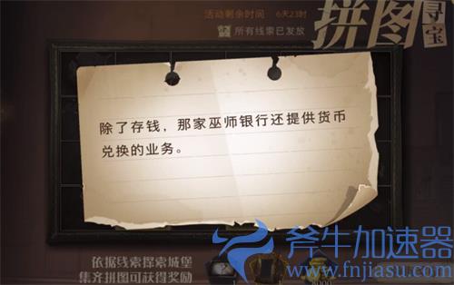 在11月10日的哈利波特魔法觉醒第五期拼图寻宝活动中,有条线索是:除了存钱,那家巫师银行还提供货币兑换的业务。很多小伙伴一脸茫然,根本找不到线索所对应的地点,本期小编就为大家带来这个线索对应拼图的具体位置讲解!