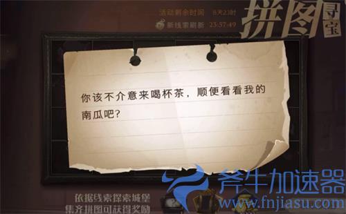 简单来说,线索“你该不介意来喝杯茶,顺便看看我的南瓜吧?”对应的地方就是禁林中的【海格小屋】,在小屋门口与海格交流、对战,即可获得拼图碎片!