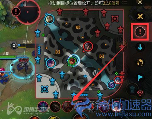 3、此时把这个感叹号,拖动到最下面的英雄头像,注意这个英雄一定要是没有出现在地图上,而且没有阵亡的角色,就会出行问号标志了。