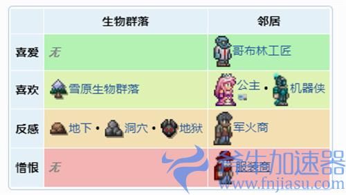 在泰拉瑞亚中,想提升NPC的快乐程度,无外乎是两种方法。一种是居住地选址在NPC喜欢的生物群落;另外一种就是让NPC同喜欢的人做邻居,避开反感讨厌的人。