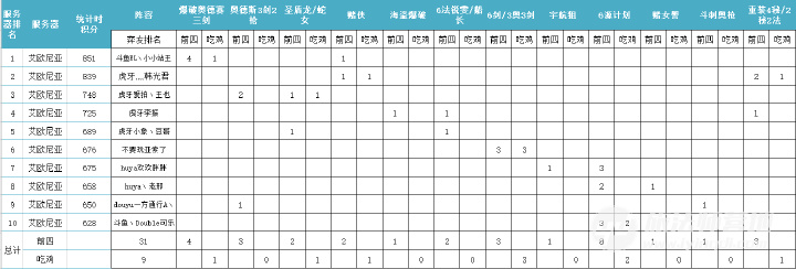 · 统计超过400分的玩家阵容,艾欧尼亚服务器排名前10名玩家,其他服务器超过400分的第一名玩家。不够场次顺延,没有玩家超过400分的服务器则不统计。