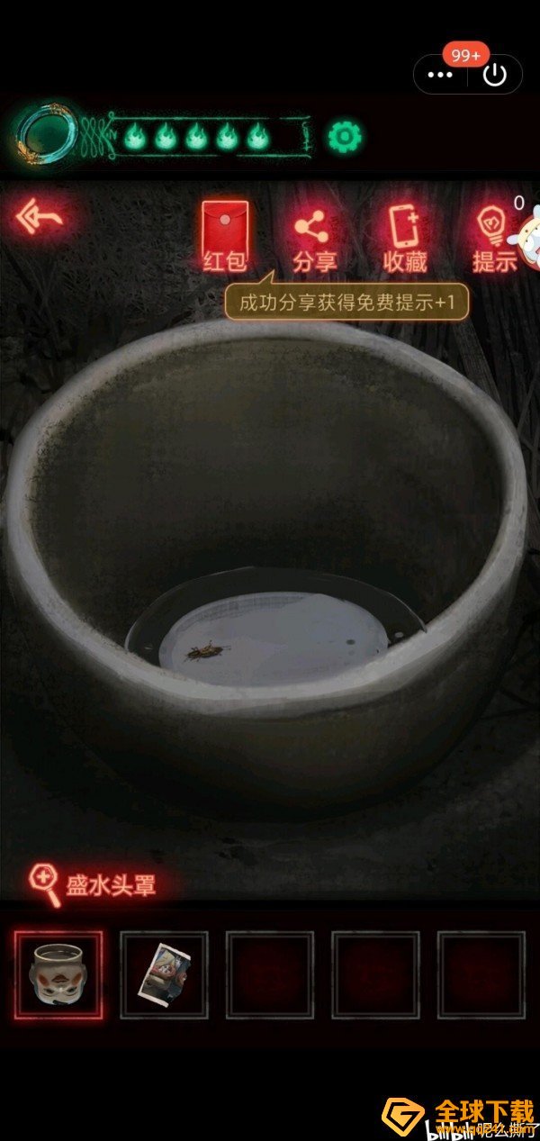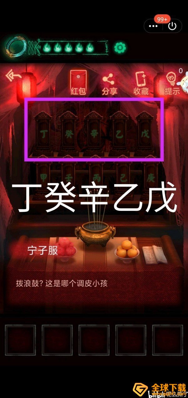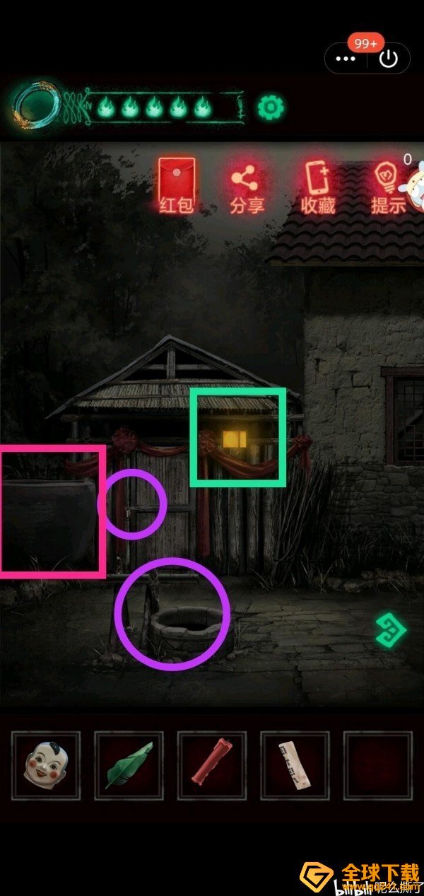 密码打开门,得到道具装在水井上。查看灯笼线索。粉色方框缸内有虫子。