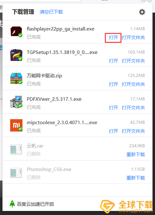 6、下载成功后,打开浏览器的下载管理,找到flash player 并打开。