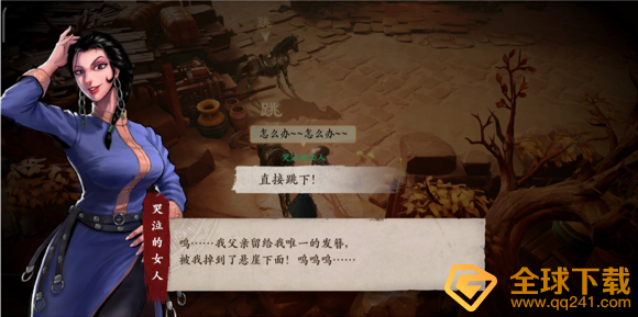 你需要和她对话,你会了解到她的发簪掉到悬崖下面去了,你需要帮助她捡回发簪。会遇见一位哭泣的女人,